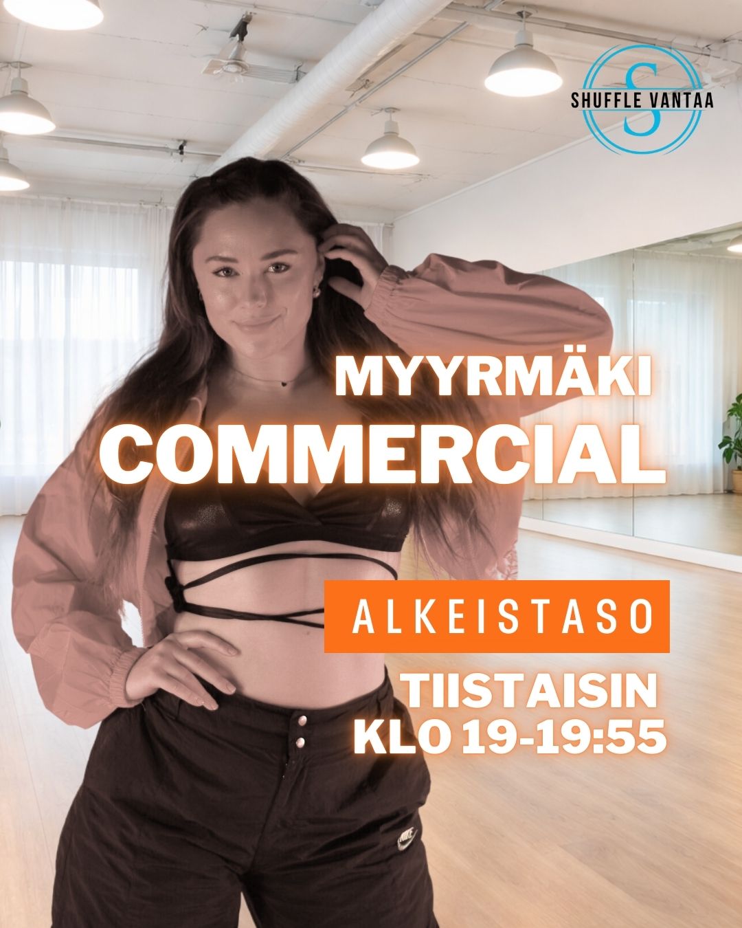 Tällä alkeistason commercial-tanssikurssilla tutustutaan näyttävään ja esiintymishenkiseen tanssityyliin, joka yhdistää vaikutteita mm. popista, hiphopista ja showtanssista. Kurssi sopii aloittelijoille, eikä aiempaa kokemusta tarvita.